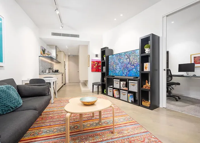 The spacious 60 m^2 Modern 1B1B Artist Apt * Wfh Study Apartment Melbourne is located in Melbourne, approximately a 10-minute ride from Immigration Museum, and offers guests an indoor swimming pool and a fitness centre. The 1-bedroom apartment is relatively near Fawkner Public Park and is situated in the St Kilda Road district of Melbourne.